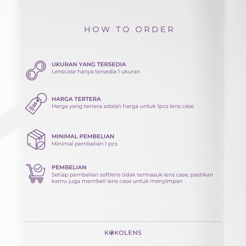 – PRODUK TIDAK TERMASUK LENS CASE, lens case dapat dibeli pada etalase toko dengan nama pencarian “Kokolens Clear Lenscase Softlens” atau “Kokolens Purple Lenscase Softlens”